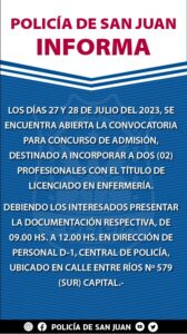La Policía de San Juan ha realizado un anuncio en busca de profesionales para cubrir dos vacantes en su fuerza. La convocatoria está dirigida a licenciados en enfermería que deseen formar parte de la institución.