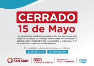 Por conmemorar el “Día del Trabajador de Obras Sanitarias”, OSSE mantendrá cerradas sus oficinas comerciales este lunes 15 de mayo de 2023, tanto en Casa Central como en las delegaciones dispuestas en los departamentos de toda la provincia.