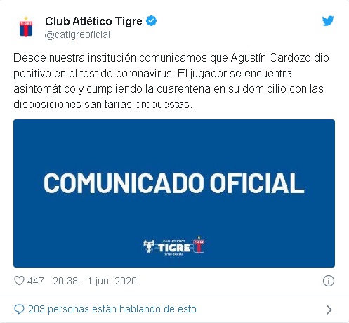 En las últimas semanas, aumentó masivamente los casos de coronavirus en Argentina. Todo indica que se está llegando al pico de contagios que justamente prevenían para el mes de junio. Y en este marco se dieron los primeros contagios en el fútbol argentino. Stephanie Rea, arquero de excursionistas que ya fue dada de alta, fue uno de los primeros casos. También Thiago Taborda, volante de la Novena División de Racing, y Camila Godoy, arquera de River, quienes se encuentran cumpliendo la cuarentena luego de dar positivos en el test. Y Agustin Cardozo, volante de Tigre, se hizo los chequeos al tener algunos síntomas y finalmente dio positivo. Así se confirmó como el primer caso de coronavirus en el ascenso.