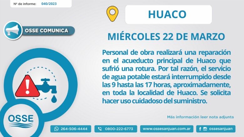 Personal de Obras Sanitarias detectó este martes, 21 de marzo de 2023, una rotura en el caño matriz del acueducto Huaco, en el departamento Jáchal. Si bien se avanza con diversas maniobras de reparación, será necesario interrumpir, momentáneamente, el servicio de agua potable durante este miércoles 22 de marzo para poder culminar con dichas tareas. En consecuencia, los usuarios verán afectado el suministro en la franja horaria comprendida entre las 9 y las 17 horas, aproximadamente.