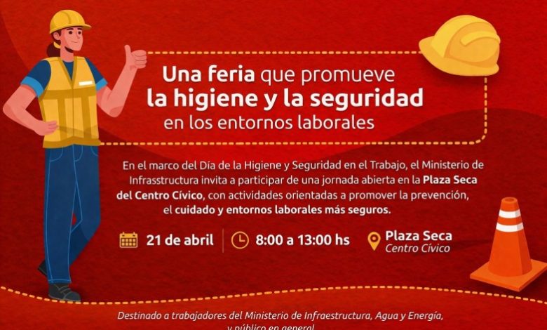En el marco del Día de la Higiene y Seguridad en el Trabajo, el próximo 21 de abril se realizará la Feria de Higiene y Seguridad en la Plaza Seca del Centro Cívico, de 8 a 13. Esta propuesta busca fortalecer la cultura del cuidado y la prevención en los entornos laborales. Esta actividad es organizada por la Dirección de Gestión de Talento e Higiene y Seguridad, del Ministerio de Infraestructura, Agua y Energía.