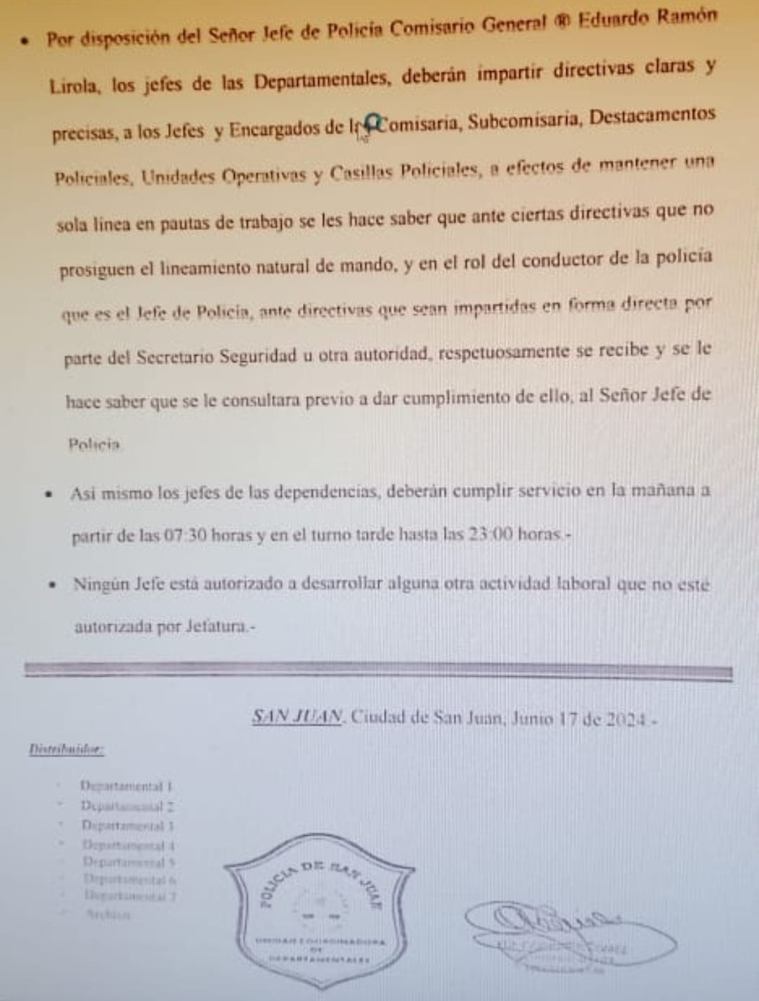 Las directivas últimas de «primero los papeles y después vamos por el delincuente» tienen bastante ofuscado al gobernador Orrego por procedimientos irracionales que lejos de resolver el acecho delictivo ralentizan las respuestas que espera la sociedad. Tema aparte es la interna feroz entre policías que le responden a Sánchez y policías que le responden a Lirola. En este sentido desde Casa de Gobierno evalúan reemplazar no solo a Sánchez sino también a Lirola porque ninguno de los dos mostró indicios de seriedad.