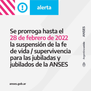 «Se prorroga hasta el 28 de febrero de 2022 la suspensión del trámite de acreditación de supervivencia para los y las jubilados y jubiladas de ANSES», informó el organismo presidido por Fernanda Raverta.