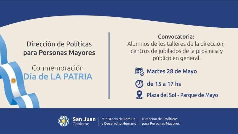 La Dirección de Personas Mayores, dependiente del Ministerio de Familia y Desarrollo Humano, invita al festejo patrio hoy en la Plaza del Sol, en las inmediaciones del Parque de Mayo, en conmemoración del 25 de mayo. La actividad comenzará a las 15 h para pasar una tarde patriótica con baile, comidas tradicionales y pregones de la época.