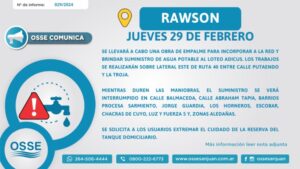 OSSE informa que este jueves 29 de febrero, se llevará a cabo una obra de empalme para incorporar a la red, que brinda el suministro de agua potable, al Loteo Adicus en Rawson. Los trabajos se realizarán sobre lateral este de Ruta 40 entre calles Putaendo y La Troja.