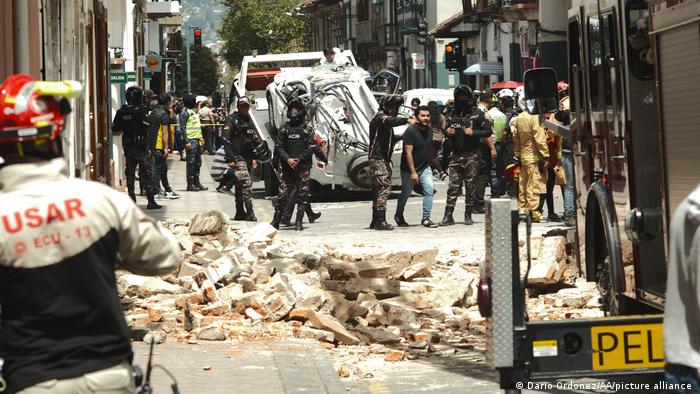 Según la Secretaría de Gestión de Riesgos de Ecuador, en Cuenca (sur) la fachada de una vivienda colapsó sobre un vehículo y dejó «una persona fallecida». Cerca, en la provincia de El Oro, se registraron tres muertos por la caída de una torre.