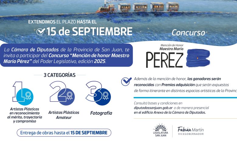 La Cámara de Diputados de San Juan invita a todos los artistas plásticos y fotógrafos de la provincia a ser parte de la prestigiosa Mención de Honor Maestro Mario Pérez, un certamen que celebra la creatividad, el talento y la diversidad artística de San Juan. El plazo se extiende hasta el 15 de septiembre de 2025. ¡Este es tu momento para dejar huella en la escena cultural de la provincia!