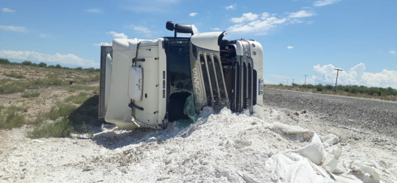 Un camión volcó en la localidad de El Encón, departamento 25 de Mayo. El siniestro vial fue protagonizado por Rolando Bustos de 39 años de edad, oriundo de la provincia de Córdoba. El transportista conducía un camión frigorífico marca Scania sin carga.
