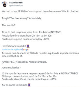 «Debido a la instalación de IA, el usuario recibe la primera respuesta instantáneamente, el servicio proporciona una solución a los 3 minutos en lugar de a las 2 horas y los costos de atención al cliente se recortaron en un 85%», publicó Shah en su cuenta.