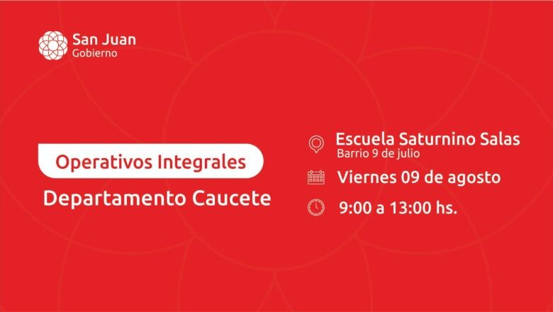 El Ministerio de Familia y Desarrollo Humano de San Juan, en conjunto con diversos ministerios provinciales, llevará a cabo el decimoséptimo operativo integral en el departamento de Caucete. Se realizará en el barrio 9 de Julio, específicamente en la Escuela Saturnino Salas, el viernes 9 de agosto, de 9 a 13.