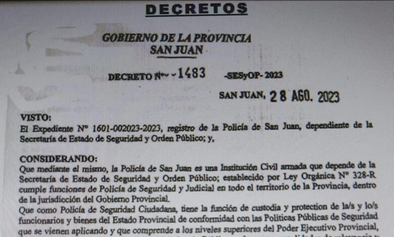 Firmado el 28 de agosto del año pasado, pero recién publicado en el Boletín Oficial el jueves 18 de enero del 2024 (hace 8 días), aparece el Decreto 1483 donde el gobernador saliente Sergio Uñac, sella la decisión de obligar al estado a que brinde custodia a los gobernadores en ejercicio y también a los que ya dejaron de serlo. La medida al parecer no estaba formalizada pero sí vigente, ya que todos podemos observar la presencia de custodios 24 x 7 en la puerta de la residencia del ex Gobernador José Luis Gioja sobre calle Güemes, pero quedaba la vaga posibilidad que la pagase «el flaco» con plata de su bolsillo.