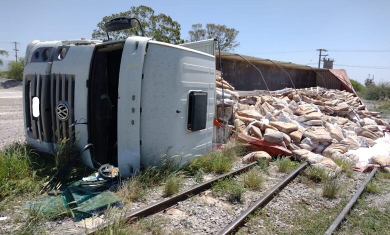 Esta tarde un camión marca Volkswagen cargado con cal volcó en Ruta 153 en la localidad de Cañada Honda, departamento Sarmiento.